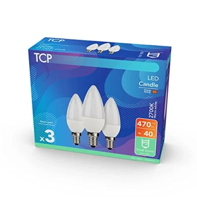Non-dimmable light in warm white Provides instant full light Perfect for use in kitchens, living rooms, bedrooms and hallways Perfect warm and bright atmosphere for studying and reading Ideal for wall lights, chandeliers and narrow table lamps Unit count: 1.0 Included components: 1 x TCP 40W 2700K 470L E14 LED Candle Small Screw Light Bulb 3-Piece pack, Warm White Efficiency: A+