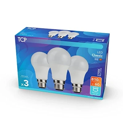 LED GLS lamp with 15,000 long life hours 2700K warm white colour temperature Provides instant full light Ideal for large table lamps, floor lamps and pendant fittings Allows you to create a cosy and warm environment Unit count: 3.0 Included components: 1 x TCP 60W 2700K 810L B22 Classic Home LED Light Bulb 3-Piece Pack, Warm White Efficiency: A+