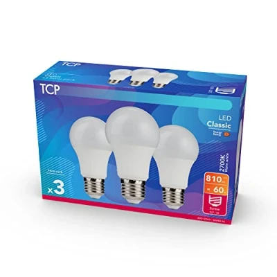 LED GLS lamp with 15,000 long life hours 2700K warm white colour temperature Provides instant full light Ideal for large table lamps, floor lamps and pendant fittings Allows you to create a cosy and warm environment Unit count: 3.0 Efficiency: A+ Power source type: AC Included components: 1 x TCP 60W 2700K 810L E27 Classic Home LED Light Bulb, 3-Piece Pack, Warm White Number of items: 1