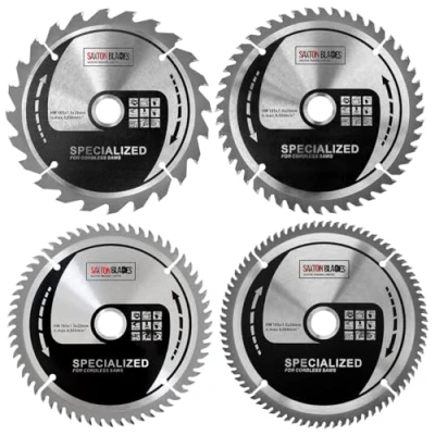 [DIMENSIONS] - 165mm Diameter – 24, 48, 60 & 80 teeth - 20mm bore (16mm reduction ring included) – 1.5mm Kerf (thickness of cut) – Plate thickness: 1.0mm – Specialised thinner blade for cordless saws – Pack of 4 [APPLICATION] - Ideal for along the grain and cross - cutting on softwood, hardwood, plywood, chipboard, multi-board panels, MDF, plated & counter-plated panels, laminated & Bi-laminate plastic, and Fibre-reinforced plastic. Providing a quality finished edge [MATERIAL] - Fully hardened steel blade body – Delivers accuracy and resists bending and deflection for true cuts. Tungsten carbide teeth provide excellent wear and heat resistance. The positive cutting angle provides fast and efficient removal of chips and swarf [FEATURES] - Specialised thinner blade for cordless saws - Incorporates an ATB (Alternating Top Bevel) offset tooth design, The angle of the tooth scores the surface of the wood in advance of the cut, cleanly cutting the wood fibres before the following teeth remove the chip. This provides for a much smoother cut, with much less chance of splintering the surface of the wood [COMPATIBILITY] – Compatible with Dewalt Bosch, Makita, Ryobi and any other cordless circular saws which use a 165mm blade with a 20mm or 16mm bore (16mm reduction rings included)