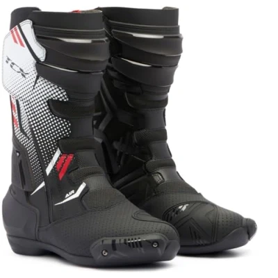 TCX Men´s S-TR1 Air Motorbike Boots black / white / red S-TR1 Air are the new sporty boots that combines the high TCX quality standards with maximum protection. Developed to protect the foot, ankle and shin the S-TR1 Air boots offer a perfect balance of safety and comfort. Ventilation is optimised by the perforated shaft and the front joint made of breathable mesh with integrated hotmelt bands to provide ideal comfort even at high temperatures. Front protection is provided by the upper rigid TPU structure and the soft lower padding. The synergy of the innovative and functional design of the shin guard with the padding guarantees excellent flexibility of the boots. The movement of the joint is controlled by the TCS (Torsion Control System), specifically designed to accompany the ankle in its optimal range of motion, avoiding unwanted twisting, overstretching and over-bending. The Groundtrax® sole with specially developed profile ensures perfect grip on the pedals of the motorbike and on the asphalt, in all weather conditions. Features: Certified sports motorbike boots designed to combine maximum safety with optimum comfort, even in the hottest climates Groundtrax® rubber outsole for racing and street riding Ortholite footbed with long-term cushioning and high breathability Reinforced polypropylene insole with differentiated thickness Side stretch fabric inserts TPU Gear shifter guard Fastening with side elastic zip and Velcro Ergonomic polyurethane heel counter with replaceable, wear-resistant magnesium side slider PU shin and ankle reinforcement Torsion Control System (T.C.S) prevents excessive twisting of the ankle joint Breathable Air Tech mesh lining Microfibre upper with laser perforation for optimised breathability