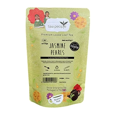 High grade green tea made up of hand rolled, young, delicate tea leaves infused in jasmine flowers When brewed, each pearl unfolds into whole leaves and yield a jasmine scented light pale brew Use 5-6 pearls per cup. These can be reinfused up to 3 times Brought to you by Tea people - a social enterprise that sends back half of its profit to help educate children in tea growing regions
