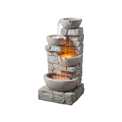 Teamson Home Cascading Bowls & Stacked Stone Outdoor Water Fountain with LED Light, Grey