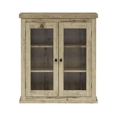 AmazonSTYLISH, RUSTIC CABINET: Light Oak cabinet with a pair of glass paneled doors and matte black hardware ADJUSTABLE STORAGE: A pair of adjustable shelves for customized storage DESIGNED FOR DURABILITY: Made of sustainable engineered wood that is less likely to warp, crack, or rot than solid wood HELPS BRIGHTEN A ROOM: glass panels reflect light and create the illusion of depth making rooms seem larger DIMENSIONS: 22.05 in. L x 7.99 in. W x 25.0 in. H