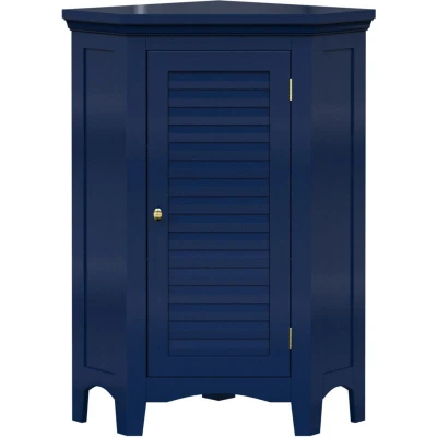 General description Teamson Home's Glancy Freestanding Corner Floor Cabinet features a stylish Navy finish, a crown molded top and skirting, shaker-style legs, and a faux louvered door. Its unique shape and size provide more storage space than a regular wall cabinet, with an interior shelf to help organize everyday items for easier access. The cabinet includes a magnetic latch that operates silently, eliminating clicking or slamming noises, making it ideal for bathrooms, kitchens, laundry rooms, and more. Technical specifications Dimensions: 24.76 in. L x 17.7 in. W x 32.01 in. H Material: Sustainable engineered wood Usage Ideal for unused corner spaces to maximize storage without taking up valuable floor space. Can be easily rearranged to suit changing needs and add a decorative statement.