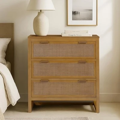 Compact Three-Drawer Layout: Provides essential storage while maintaining a slim footprint ideal for tight spaces. Natural Rattan Drawer Fronts: Textured detailing softens the design and adds visual interest. Strong Wood Construction: Solid pine frame with acacia veneer supports long-term daily use. Easy Drawer Access: Smooth operation allows frequent use without resistance or sticking. Natural Finish Styling: Light wood tone enhances brightness and complements neutral décor.