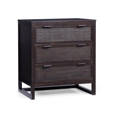 Three-Drawer Storage Solution: Compact dresser design offers practical organisation for smaller bedrooms and limited spaces. Textured Rattan Accents: Drawer fronts introduce depth and natural warmth to the streamlined design. Durable Mixed Wood Frame: Pine wood and acacia veneer construction ensures dependable everyday strength. Smooth Drawer Operation: Drawers glide comfortably for easy access to folded clothing and accessories. Mocha Brown Finish: Dark tone adds richness while pairing easily with modern or classic interiors.