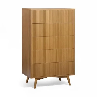 Five-Drawer Vertical Storage: Tall design maximises storage capacity while preserving valuable floor space. Fluted Drawer Texture: Subtle vertical grooves add character and elevate the minimalist silhouette. Solid Support Structure: Rubberwood legs and reinforced frame ensure stability during everyday use. Smooth Drawer Operation: Ball-bearing glides allow effortless access even with heavier contents. Natural Wood Appearance: Light acacia veneer finish complements neutral and modern interiors.