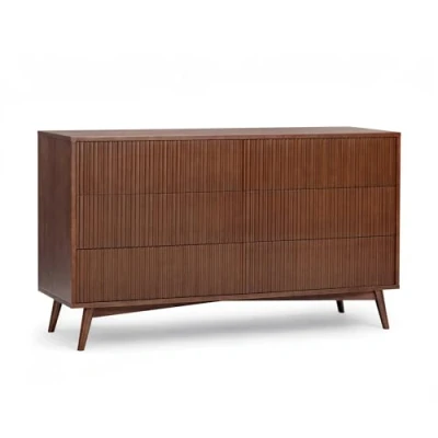 Wide Six-Drawer Design: Horizontal dresser offers spacious, evenly sized drawers ideal for shared bedrooms or primary suites. Fluted Front Styling: Textured drawer fronts add depth while maintaining a clean, handle-free appearance. Durable Wood Materials: Acacia veneer over engineered wood provides strength and a consistent wood grain finish. Heavy-Duty Drawer Support: Each drawer is designed to handle daily storage needs with smooth, reliable movement. Warm Walnut Finish: Rich colour adds warmth and sophistication to modern bedroom settings.