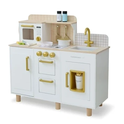 ICE DISPENSER: Working ice maker drops pretend cubes for realistic play INTERACTIVE CONTROLS: Clicking knobs and sink tap support hands-on interaction ACCESSORY SET: Includes 17 kitchen accessories PRACTICAL STORAGE: Cupboards and hooks help keep items organised COMPACT FOOTPRINT: Ideal for bedrooms or playrooms, Manufacturer: Teamson