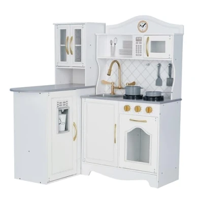 ELEGANT NEUTRAL DESIGN – This stunning kitchen has a retro design finished in white with gold accents, making it look very elegant and premium look. The neutral white with the subtle gold hints means this play kitchen is very versatile so will complement a wide range of room decors. MULTIPLE FUNCTIONS – Equipped with a range of kitchen utensils so your little chef can experience the joy of cooking. The kitchen includes pan, pot, stove, microwave, oven, removable sink,3 rotatable knobs, rotatable taps, and some storage shelves and drawers to store all their cooking items to help prevent a mess. REAL-LIFE EFFECTS – The stove will light up red and produce a boiling sound when you place the pot or pan on the top, mimicking a real-life cooking experience. Closing and opening the microwave door will trigger a sound and light inside creating the impression of a real microwave and turning the stove knobs will have the clicking sounds to give your child an ultimate fun play experience. L SHAPED TWO PIECES SET - The L shaped kitchen allows you to store it in the corner easily, or take it apart to arrange it according to your room layout. The island allows kids to play with their siblings or friends and provide more space for storage., Manufacturer: Teamson