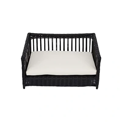 AmazonDESIGN: Featuring a lavish brown wicker rattan basket effect , this rectangular pet bed or sofa lounger can be used indoors or outdoors in the garden, lawn, patio or decking. Suitable for cats and small dogs up to 30kg. DETAILS: Raised rims around the pet lounger creates a sense of security. The rectangular shape is perfect for all kinds of furry friends at any stage of their lives from kittens to cats and puppies to small dogs. WATER RESISTANT: Both the pet bed and the removeable cushion can be washed. For smaller messes, the pet bed can be simply wiped down. DURABILITY: Constructed from rattan with a metal frame and a soft pillow which provides long lasting use and comfort for your cat or dog. ASSEMBLY: Instructions included. Quick and easy assembly. The Clotho pets bed measures (cm): 66.0(L) x 48.0(W) x 35.0(H). The product packaging measures (cm): 67.5(L) x 50.0(W) x 36.0(H).