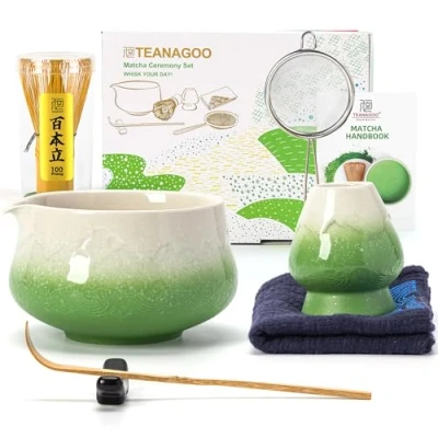 7-PCS MATCHA WHISK SET GREEN: 1*Ceramic Bowl (chawan) 560 Ml/18.9 Oz, 1*Bamboo Whisk, 1*Bamboo Scoop (chashaku), 1*Cermaic Whisk Holder, 1*Ceramic Scoop Stand, 1*Cotton Tea Cloth (chakin), 1*Matcha Powder Sifter.includes All Accessories HIGH SAFETY & QUALITY: Our Handcraft Matcha Whisk, About 100 Fine Tines(百本立),100% Crafted From High Quality Bamboo With A Vegetable Oil Finish To Enhance Its Durability. Additionally, Our Ceramic Bowl Has Lead-free And Mercury-free Test Reports.food-grade And Eco-friendly GREAT MATCHA SET GIFT: Our Matcha Kit Shows Health and Ceremony. Includes All Necessary Accessories for A Matcha Tea Set. A Wonderful Gift for Matcha Lovers. Perfect Gift Idea for Friends And Family on Birthdays, Mother's Day, Teacher's Day, Valentine's Day, Christmas, Etc UNIQUE DESIGN OF MATCHA BOWL: Special Pouring Mouth Design, Making It Easy To Share Matcha With Friends And Family. Matcha Bowls And Whisk Holders In The Same Color Enhance The Sense Of Ceremony ENJOY THE FUN OF CREATING MATCHA: Perfect For Crafting Healthy Breakfast Drinks Like Matcha Latte, Matcha Milk In The Morning. Harness Your Hands-on Abilities And Relish The Process. Suitable For Home Or Office Use, Manufacturer: TEANAGOO