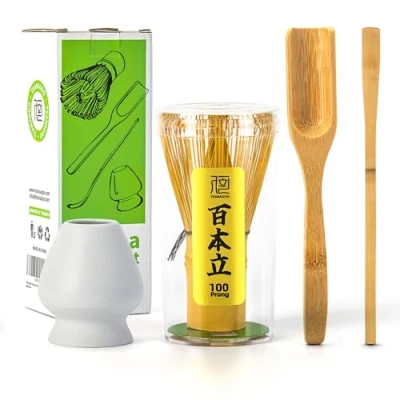 GREAT ACCESSORY SET FOR MATCHA TEA CEREMONY. It contain: 1* Hand Crated Whisk --- Produces the best crema and froth.1* Scoop -- measures the perfect amount of powder. 1*Spoon -- for stirring your Matcha when it settles. Or measure power for big amount using occasion like matcha cake, 1* Porcelain Whisk Holder -- Keep whisk in good shape, last longer. This kit makes it very easy to adopt matcha as a lifestyle HIGH QUALITY BAMBOO WHISK: Our pronged whisk handcrafted about 76 fine tines, engineered to create optimal agitation and it’s crafted in the perfect shape to whisk, blend effectively, and froth perfectly whisk up a frothy cup of tea. A RELAXING CEREMONY and SUPERIOR FLAVOR - Enjoy and relax with authentic matcha at home efficiently. UNIQUE GIFT IDEA: This Accessory set was paced in a nice color box, contain all necessary acccessories for a nice Matha tea ceremony. It is nice gift for Matcha tea lover. Or impress your loved one by sharing a kit that allows them to prepare the most naturally beneficial drink in the world! NATURAL & FOOD-SAFE: The entire set is constructed of all natural bamboo+high quality procelain. No mysterious varnishes or other chemicals were used in this product. It is made from bamboo with a vegetable oil finish to enhance its durability. The Procelain holder is Food Safe, Lead & Cadmium Free. The high quality makes it sturdy and durable. PACKAGING: Product packaging may vary over time. The contents remain the same., Weight: 0.19 Kilograms, Manufacturer: TEANAGOO