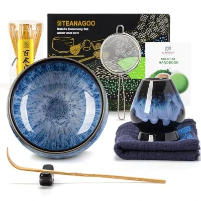 PREMIUM MACHATA CEREMONY SET. It is 7 pcs / set, Contain:: 1* Bamboo Whisk, 1* Bamboo Scoop (Chashaku), 1*Ceramic Bowl (Chawan) 510 ml/18 oz, 1* Cermaic Whisk Holder. 1* Ceramic Scoop Stand, 1* Cotton Tea Cloth (Chakin), 1* Matcha Powder Sifter. This kit makes it very easy to adopt matcha as a lifestyle HIGH QUALITY BAMBOO WHISK: Our pronged whisk handcrafted about 76 fine tines (百本立), engineered to create optimal agitation and it’s crafted in the perfect shape to whisk, blend effectively, and froth perfectly whisk up a frothy cup of tea. MATCHING COLOR DESIGN: Same color for matcha bowls & whisk holder, higher sense of ceremony. Impress your loved one by sharing a kit that allows them to prepare the most ly beneficial drink in the world! UNIQUE GIFT IDEA: This Accessory sets was paced in a nice color box, contain all necessary acccessories for a nice Matha tea ceremony. It is nice gift for Matcha tea lover. The entire set is constructed of all bamboo+high quality Ceramic. No painting were used in this product. It is made from 100% bamboo with a vegetable oil finish to enhance its durability. The matcha bowls was Food Safe, Lead & Cadmium Free. The high quality makes it sturdy and durable., Manufacturer: TEANAGOO