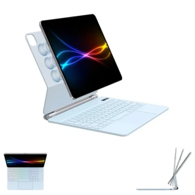 [Compatibility] Fits iPad Air 13" 2026/2025/2024 (M4/M3/M2) and iPad Pro 12.9" 2018-2022 (3rd/4th/5th/6th Gen). Model numbers: iPad Air 13 - A3268, A3269, A3271, A2898, A2899, A2900. iPad Pro 12.9 - A2436, A2437, A2764, A2766, A2378, A2461, A2379, A2462, A2229, A2069, A2232, A2233, A1876, A2014, A1895, A1983 [MacBook-Style Productivity] Like magic, your iPad connects via Bluetooth and feels like a laptop for emails, reports, learning apps, travel and everyday productivity (without using trademarked wording). [Floating Magnetic Stand] Cantilever “floating” design gives a comfortable viewing angle for typing, drawing, meetings and video calls. Open the case and your iPad wakes instantly. [Quiet Scissor-Switch Keys] Smooth, low-noise keys deliver fast and accurate typing - ideal for office, students, classrooms and shared environments. [Precision Multi-Touch Trackpad] Built-in trackpad supports multi-gesture control: swipe, scroll, zoom and quick switching between apps for efficient editing and multitasking. [Backlit QWERTY Keyboard] 7-colour backlight with adjustable brightness for low-light typing, travel and night work. Smooth, quiet keys for shared spaces like classrooms, NHS environments and open-plan offices. [Smart Bluetooth Memory] Remembers your last pairing and reconnects quickly when powered on, so you can open, type and get straight to work. [Battery + LCD Status Display] 500mAh rechargeable battery supports up to 30 days use (backlight off). LCD display shows battery, caps lock, connection and charging status. [Slim Protection for B2B Use] Soft-touch protective design keeps your iPad secure in bags and busy environments - ideal for schools, NHS, field staff, corporate rollouts and remote working.