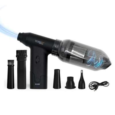 160W High-Performance Vacuum & Blower: This mini air blower features a high-performance 160W motor with both vacuum and blower capabilities, making it perfect for removing fine dust from computers, keyboards, sofas, and cars. Achieve powerful air pressure up to 6.5 kPa for deep cleaning in a single pass; Customizable Stepless Power Control: Effortlessly fine-tune suction and blowing power with the stepless speed adjustment, ideal for delicate surfaces like keyboards or more demanding areas such as car interiors. Adjust the intensity to suit your specific cleaning needs for optimal results; Extended 2500mAh Battery & Quick Charge: Equipped with a 2500mAh battery, this air duster gun provides up to 120 minutes of continuous use on a single charge. Recharge quickly in just 3.5 hours via USB Type-C, ensuring it's always ready for use without long downtime; 5 Attachments for Versatile Use: This portable hoover comes with 5 detachable nozzles designed for different cleaning tasks. They include a vacuum cup adapter with filter / nozzle adapter for static dust, a dust broom, bed nozzle, universal deflate attachment and a toy inflation nozzle, which allow you to effectively remove dust, crumbs, and dirt from various surfaces and areas; Compact, Lightweight, and Quiet Design: Weighing only 232g and measuring 13.8 x 10.6 x 3.6 cm, this blower is highly portable and easy to maneuver. Made from durable ABS material, it operates at a low noise level of under 90dB, ensuring a comfortable cleaning experience., Weight: 0.4850169764 pounds, Manufacturer: Technaxx