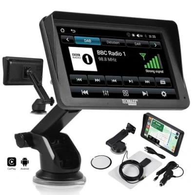 Wireless Apple CarPlay & Android Auto integration: Use Apple CarPlay or Android Auto wirelessly via stable WiFi and Bluetooth 5.0. Access navigation, music, calls, voice assistants and compatible apps directly on the 7-inch display without replacing your factory car radio; Built-in DAB digital radio for clear sound quality: Enjoy digital radio reception via DAB (Band III: 174–240 MHz) for improved audio clarity and reliable signal. FM radio reception is also supported for full compatibility; 7-inch capacitive touchscreen display: The responsive 7-inch touchscreen provides clear visuals for maps, menus and media content, offering intuitive touch control and good visibility in different lighting conditions; Flexible audio output to existing car systems: Audio can be transmitted via AUX cable or wirelessly using FM transmission to your existing car radio. A built-in speaker allows direct playback without additional equipment; Easy installation without vehicle modification: Quick installation on the windscreen or dashboard using the included mount. Powered via 12V/24V cigarette lighter, suitable for cars, SUVs, vans and motorhomes.