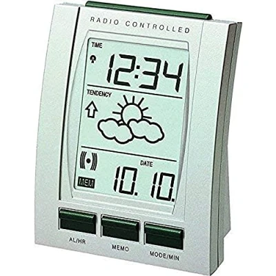 DCF-77 Radio controlled clock Date and weekday display MEMO alarm function : Memory of the current and last 3 alarm times, rapid resetting of each stored alarm from the MEMO function Indoor temperature display Forecast of weather situations and weather tendency