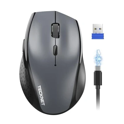 Rechargeable and Energy-Efficient Design: The TECKNET PRO Wireless Mouse is equipped with an 800mAh rechargeable battery that lasts up to 3 months (based on 6 hours of daily use) and can be used while charging, It also features an auto-sleep mode, on/off switch and low battery indicator, which greatly extends the life of the mouse 6400 DPI Ultra Precise Tracking: This wireless mouse for laptop features 6 adjustable DPI (6400/4800/ 3200/2400/1600/1000), allowing you to customize cursor sensitivity for any task—from detailed design work to high-speed gaming. Powered by TECKNET TruWave Optical Tracking Technology, it delivers smooth, precise control on virtually any surface—no lag, no skipping Silent Click: Wireless Computer mouse adopts TECKNET silent touch technology reduces 90% of clicking sounds compared to a traditional mouse, Left and right click of the wireless mouse for laptop are very quiet that you will never worry about disturbing others 6 Efficient Buttons: This wireless silent mouse greatly improves your efficiency and meets all your functional needs. The side buttons of the cordless mouse make browsing the web a breeze by allowing you to easily turn pages (Note: The side button is invalid in Mac OS) Stable Wireless Connection: Our laptop mouse uses advanced 2.4 GHz wireless technology, ensuring stable and quick performance up to 15m. This usb mouse supports plug and play, so simply connect the included USB Nano receiver to the USB port of your computer, no additional driver is needed Durable Click Lifespan & Wide Compatibility: This mouse for laptop passed 8,000,000 times keystroke test to guarantee extra durability. 2.4G silent mouse wireless is compatible with a wide range of systems, including Win11, Win10, Win8, Win7.XP.Mac OS X10.4 or above What You Get: 1 x TECKNET PRO Wireless Mouse, 1 x USB Receiver,1 x Type C Cable, 1 x User Manual and Support available for 36 months (Registration Required)