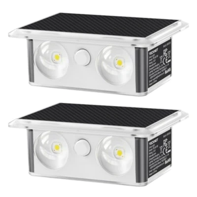 【UP/DOWN Dual-Lens Design, Ultra-Bright】 4 LEDs beads paired with precision optical lenses utilize the focusing principle of convex lenses to achieve both high-focusing and wide-coverage light, enhancing solar fence lights penetration & brightness. Allows each solar wall lights to emit a more focused and intense beam, achieving clear illumination of a wide area with fewer fence lights, unaffected by darkness, rain, fog, or other complex environments 【200° Lighting Coverage】 TECKNET solar fence lights outdoor garden innovatively adopts a 200° W-shaped wide-angle design (100° for each lens), allowing a clear, bright beam to evenly & softly overlap and cover the wall, achieving both a wide field of vision and ample illumination with a high-end decorative feel. Illuminating courtyards, walls, and fences enhances their outstanding style 【8 Lighting Modes for Customized Ambiance】The fence lights solar powered features 1 dynamic RGB cycle mode + 7 static monochrome modes (warm white/red/green/blue/yellow/cyan/purple) - can easily switch by using the button to match different scenes. Warm white light creates a cozy evening, suitable for general lighting; dynamic RGB mode is vibrant & lively, making it the top choice for parties; and the monochrome mode is suitable for romantic gardens and festive atmospheres (Christmas, Halloween, etc.), creating a romantic ambiance for gardens and poolside areas, making outdoor spaces less monotonous 【35% High Efficiency Conversion, Doubled Battery Life】Our fence solar lights outdoor waterproof is equipped with A+ grade monocrystalline silicon solar cells with a conversion rate of up to 35%. Only 4-6 hours of sunlight is needed to achieve 12-20 hours of continuous lighting, more than double the battery life of similar products. No wiring & electricity cost—simply install garden fence lights in a sunny location, it will automatically turn on at dusk and automatically turn off at dawn, saving energy and providing convenience 【IP66 Waterproof, Durable in All Weather】This outdoor solar wall lights is made of high-quality weather-resistant ABS material, combined with precision sealing technology, achieving an IP66 waterproof rating, can effectively resists various harsh weather conditions. The solar lights for fence operates in temperatures ranging from -20°C to 55°C, possessing excellent cold and heat resistance. It is not prone to aging or deformation even after long-term use, making it an ideal choice for outdoor locations such as gardens, fences, patios, or poolsides—no need to worry about damage 【Tool-Free, Multiple Scenarios】 Fence solar lights includes screws and strong double-sided adhesive, allowing for quick & easy installation on any outdoor surface such as walls, fences, patios, and garden pillars in minutes, without the need for professional tools. Widely applicable to backyards, paths, pool areas, outdoor dining areas, and other scenarios, it enhances the charm of your yard and improves nighttime walking safety, making it an ideal choice for home decoration and holiday decorations. TECKNET outdoor solar lights offer 36-month technical support (registration only). Reach out with any questions