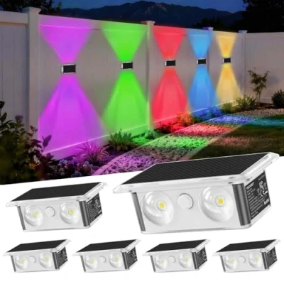 【UP/DOWN Dual-Lens Design, Ultra-Bright】 4 LEDs beads paired with precision optical lenses utilize the focusing principle of convex lenses to achieve both high-focusing and wide-coverage light, enhancing solar fence lights penetration & brightness. Allows each solar wall lights to emit a more focused and intense beam, achieving clear illumination of a wide area with fewer fence lights, unaffected by darkness, rain, fog, or other complex environments 【200° Lighting Coverage】 TECKNET solar fence lights outdoor garden innovatively adopts a 200° W-shaped wide-angle design (100° for each lens), allowing a clear, bright beam to evenly & softly overlap and cover the wall, achieving both a wide field of vision and ample illumination with a high-end decorative feel. Illuminating courtyards, walls, and fences enhances their outstanding style 【8 Lighting Modes for Customized Ambiance】The fence lights solar powered features 1 dynamic RGB cycle mode + 7 static monochrome modes (warm white/red/green/blue/yellow/cyan/purple) - can easily switch by using the button to match different scenes. Warm white light creates a cozy evening, suitable for general lighting; dynamic RGB mode is vibrant & lively, making it the top choice for parties; and the monochrome mode is suitable for romantic gardens and festive atmospheres (Christmas, Halloween, etc.), creating a romantic ambiance for gardens and poolside areas, making outdoor spaces less monotonous 【35% High Efficiency Conversion, Doubled Battery Life】Our fence solar lights outdoor waterproof is equipped with A+ grade monocrystalline silicon solar cells with a conversion rate of up to 35%. Only 4-6 hours of sunlight is needed to achieve 12-20 hours of continuous lighting, more than double the battery life of similar products. No wiring & electricity cost—simply install garden fence lights in a sunny location, it will automatically turn on at dusk and automatically turn off at dawn, saving energy and providing convenience 【IP66 Waterproof, Durable in All Weather】This outdoor solar wall lights is made of high-quality weather-resistant ABS material, combined with precision sealing technology, achieving an IP66 waterproof rating, can effectively resists various harsh weather conditions. The solar lights for fence operates in temperatures ranging from -20°C to 55°C, possessing excellent cold and heat resistance. It is not prone to aging or deformation even after long-term use, making it an ideal choice for outdoor locations such as gardens, fences, patios, or poolsides—no need to worry about damage 【Tool-Free, Multiple Scenarios】 Fence solar lights includes screws and strong double-sided adhesive, allowing for quick & easy installation on any outdoor surface such as walls, fences, patios, and garden pillars in minutes, without the need for professional tools. Widely applicable to backyards, paths, pool areas, outdoor dining areas, and other scenarios, it enhances the charm of your yard and improves nighttime walking safety, making it an ideal choice for home decoration and holiday decorations. TECKNET outdoor solar lights offer 36-month technical support (registration only). Reach out with any questions