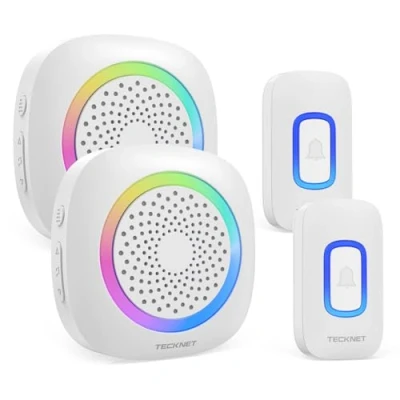 【Portable Design and Versatile Use】: The cordless doorbell does not necessitate WiFi or power sockets. The receiver and transmitter can be positioned at your convenience and utilized as a pager. The receiver may be situated on a tabletop or kept in your bag as you prefer. Whether you're in the cellar, the garage, or the garden, you'll always be aware of your visitors 【36-Month Long Battery Life】: This cordless doorbell comes equipped with a sleep function. After a few minutes of non-activity, the door chime kit enters sleep mode. Press any button to awaken the receiver. The receiver operates on 3 AA batteries (not provided) and can last for up to 36 months of daily usage, reducing the need for frequent battery replacements 【RGB Light Indicator Cordless Doorbell】: The RGB light indicator on the battery-powered receiver flashes upon transmitter activation and receipt of a signal. The high-decibel 110 dB volume can alert those who are hearing impaired or elderly. You can silence the front door bell when no ringtone is needed and rely on the RGB light to visually notify you when someone is at the door 【60 Melodies, 5 Volume Levels & Memory Function】: This outdoor waterproof cordless doorbell offers 60 selectable melodies, 5 adjustable volume levels ranging from 0 dB to 110 dB, and a silent mode to cater to your preferences. The memory function ensures that the cordless doorbell kit recalls the last chosen melody and volume setting, even in the event of a power outage 【400 Meter Cordless Range】: The TECKNET cordless doorbell boasts a working range of up to 400 meters in open spaces without disrupting other nearby cordless devices. A robust and stable radio signal ensures you'll never miss a visitor. Note: The provided transmitter contains batteries, whereas the receiver does not (Requires 3 AA batteries) 【IP66 Waterproof & Dustproof】: The cordless doorbell flaunts a stylish contemporary design, with superb materials that shield the doorbell push button from elevated temperatures and interference. The battery-operated front doorbell is waterproof up to IP66 and robust enough to withstand extreme environments. It maintains a cordless transmitter in wet weather conditions and operates in diverse climates from -20 ℃ to 60 ℃ 【 36-Month No Worries Guarantee】: Should you experience any issues whilst using the product, don't hesitate to reach out to our professional customer support team, and take advantage of TECKNET's 36-Month Warranty (Registration Required), Manufacturer: TECKNET