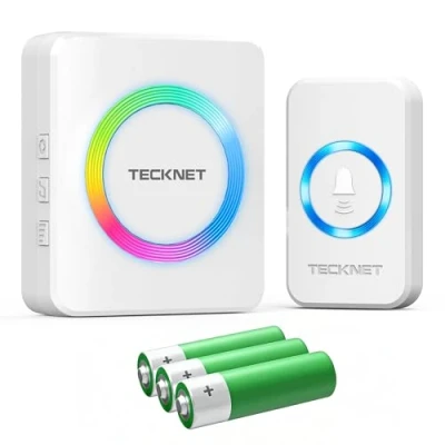Portable Doorbell: The battery-powered doorbell receiver can be carried with you or placed freely, eliminating the need for complex installation or consideration of power supply layout. It meets your needs for mobile use in different areas, both indoors and outdoors 400M Operating Range: The wireless doorbell boasts an approximate operating range of 400 metres (≈1300 feet) in open areas. Whether you're in the bedroom, living room or basement, you'll receive timely and stable signals without missing any visitors 3 Operating Modes: Wireless door bell offers three distinct modes: LED only (silent mode), chime only, and LED + chime. Suitable not only for family rest periods or other environments requiring quiet, but also for everyday use or gatherings such as parties 60 Ringtones with Memory Function: Door bells wireless cordless features 60 built-in ringtones with 5-level adjustable volume (maximum 120db). Once configured, the door bell automatically retains the last selected ringtone and volume setting, ready for use upon power-up Stable and Durable: IP66 doorbells wireless, robustly dustproof and waterproof. Capable of withstanding severe weather conditions including heavy rain, snowstorms and high temperatures, operating reliably within temperatures ranging from -20°C to 60°C Long-lasting Battery Life: The receiver utilises a CR2032 battery with ultra-low power consumption technology, offering up to 4.5 years of operation without frequent replacement. The doorbell receiver is powered by 3 AA batteries (not included), ensuring convenient replacement Complete Kit & Easy to Install: Cordless doorbell includes transmitter*1 (CR2032 battery included), receiver*1 (AA battery*3 not included), installation kit*1, instruction manual*1. Button may be secured to the door frame with screws or fixed using double-sided adhesive tape for an aesthetically pleasing and convenient solution, Manufacturer: TECKNET