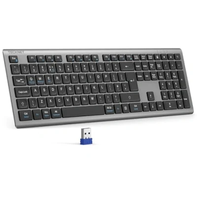 【2.4G Plug-and-Play Wireless Keyboard】No complex setup, just insert the nano USB receiver, and start typing instantly. TECKNET 2.4GHz stainless wireless keyboard for laptop delivers seamless connectivity within 15m range – perfect for clutter-free desks and immediate productivity 【500mAh Rechargeable Keyboard】TECKNET computer keyboard which built-in 500mAh rechargeable lithium battery lasts about 3-4 months. The auto-sleep mode wakes up instantly with any key press, without delay. 2-hour charge can last up to 3-4 months (estimated based on 2 hours of daily use) 【Ergonomic Design】The full-size UK layout ergonomic keyboard with dedicated numpad accelerates data entry. Smart hotkeys (Fn lock/one-tap mute/volume control) streamline workflows. Ergonomic 8° tilt reduces wrist strain during extended sessions 【Silent Typing】The TECKNET silent keyboard reduces noise by over 90% with its upgraded scissor design.The low-profile keys ensure silent and comfortable typing on this wireless keyboard. Keycaps are built to last, with a lifespan of up to 10 million clicks 【Durable Stainless and ABS Construction】The slim keyboard crafted from reinforced stainless steel frame and scratch-resistant ABS keycaps, the keyboard wireless withstands daily wear, professional look. The spill-proof design ensures no little accidents in home or office 【Keyboard with Wide Compatibility】This computer keyboard is compatible with various devices and operating systems, including Microsoft Windows 11/10/8.1/8/7/XP and more 【What You Will Get】TECKNET 2.4G rechargeable low profile keyboard, nano USB receiver, USB charging cable,user Manual,friendly customer service and support available for 12 months (Registration Required)