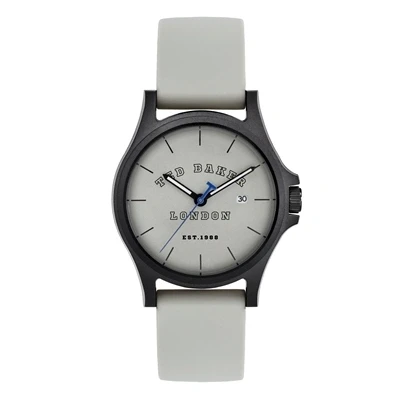 An exquisite gift choice for him, this Ted Baker watch will add a contemporary finish to his every look. This varsity inspired watch features a sporty grey silicone strap. A matte black resin dial is the perfect contrast to the neutral tones of this timepiece. A grey background features an arched Ted Baker logo with a sharp black outline, along with black hour markers. A date window at the number four adds a fresh spin to this watch. White and blue detailing on the hands adds a quirky finish that Ted Baker is famous for! Resin case Silicone strap Date window Case diameter: 40mm Watch strap length 16cm excluding case, width 2cm