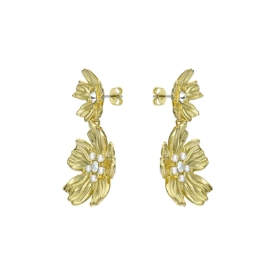 We are in floral heaven with these glamorous Ted Baker earrings. Crafted in a gold tone, these drop earrings feature a statement double floral motif, with a rippled texture on the petals, and faux pearl and white crystal details. Style these earrings as part of your next evening look for a stunning statement piece. Gold tone Double floral motif Faux pearl and white crystals details Drop earrings Length: 3.3cm