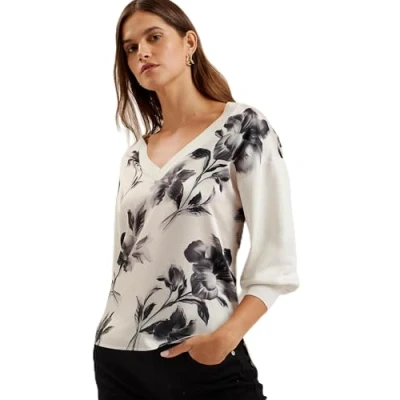 Ted Baker Women's WMK JOIEE V Neck Printed Woven Front Jumper Sweater, Ivory, 14