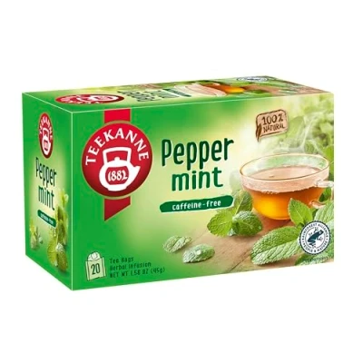 TEEKANNE Peppermint Tea is a refreshing and invigorating blend made from pure peppermint leaves. This crisp and cool tea offers a soothing and revitalizing experience with every sip, the naturally included essential oil gives this infusion a pleasant and refreshing taste. It brings a burst of natural minty freshness to your cup, making each moment a rejuvenating escape. Each cup, marked with the Rainforest Alliance Seal, guarantees environmentally responsible sourcing and the highest standards of quality. Made with the finest ingredient, this tea captures the essence of peppermint in its purest form, showcasing TEEKANNE'S dedication to quality control and delivering a rich, full-bodied taste that celebrates the authentic flavour of a healthy herbal tea. At TEEKANNE quality is our highest priority form the leaf to your cup. Drawing 135 years of experience and a passion for tea, TEEKANNE never settles for less than the best. With 135 years of experience TEEKANNE is No.1 for the complete tea category in European core markets and No.1 in herbal and fruit infusions worldwide. This tea is 100% natural, no additives, or artificial flavourings. The ingredients used in our harmonious blends are carefully analysed by our own quality control laboratory in Germany. 20 Individually Wrapped Double Chamber Tea Bags to Preserve Freshness. TEEKANNE gives the highest priority to packaging optimization and reduction. The folding cartons in which our tea is sold are made of 100 % FSC-certified cardboard and thus come from sustainable forestry. Rainforest Alliance Certified. ECO friendly packaging means no plastic! Another important measure for TEEKANNE is to discontinue the use of plastic wrap for their products in the retail market.