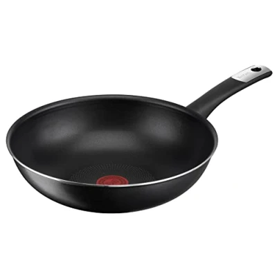 Wok pan with extra durable Tefal non-stick coating on the outside and titanium 2x non-stick coating with reinforced structure and an additional protective layer with titanium particles inside With integrated temperature indicator, thermal signal: indicates when the pan has reached the ideal starting temperature for roasting, ensuring perfect results with consistency, colour and taste Diffusion pan base: ensures optimal heat distribution throughout the pan and thus allows perfect frying results Hob type compatibility: suitable for all heat sources, except induction (gas, electric, glass ceramic) Easy to clean: the high-quality non-stick coating is very easy to clean, and the pan is dishwasher safe (for a long service life, we recommend cleaning by hand)