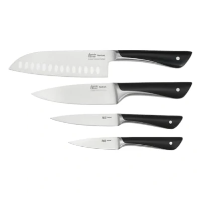 4 PIECE KNIFE SET: 16.5cm Santoku Knife, 15cm Chef Knife, 12cm Utility Knife and 9cm Paring Knife THE ULTIMATE KITCHEN KNIFE SET: Jamie Oliver and Tefal make the perfect food pairing. Jamie brings the passion and food knowledge; Tefal provides the technology and performance. Together they've proudly made quality, trusted products for two decades that make cooking from scratch a real joy. It's the smart choice for feel-good food. SUPERIOR PERFORMANCE: These high-quality German stainless steel blades are ice hardened for superior performance. A thermal shock is applied, dropping their temperature from 1000°C to -120°C, making them hardwearing and long-lasting. WHATEVER YOU WANT TO PREP AND COOK: "This fantastic four-piece knife set will have you covered. Prepping a beautiful salad, deseeding chillies, slicing fresh herbs, cutting quality meat, thinly slicing salmon, dicing fruit and effortlessly chopping veg for a quick midweek meal – there's a top-quality knife here for every kind of prep. Let’s get cooking!" - Jamie Oliver BEAUTIFULLY WEIGHTED KITCHEN KNIVES: For a comfortable and secure grip while you prep your fresh ingredients.