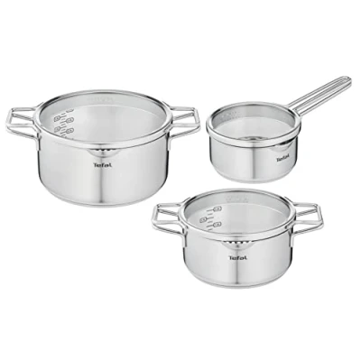 Tefal Nordica Set of 3 Pots + Lids: 2 Saucepans 20/24 cm, 16 cm Stainless Steel Saucepan, Glass Lids, Full Induction Technology, Minimalist, All Types Hobs, Oven Safe
