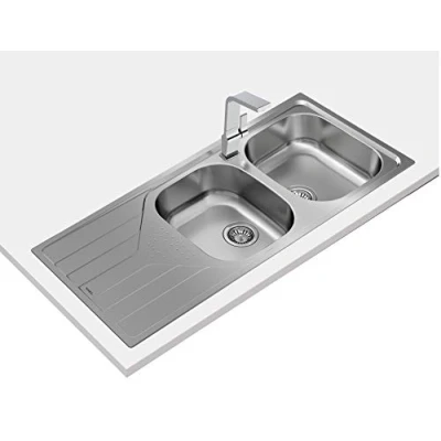 Stainless steel sink, polished finish. Two buckets and drainer, reversible. Recessed installation. Manual valve drain with 3½" basket and siphon. Depth of bucket 170 mm. 80 cm cabinet Dimensions H x W x D (cm): 50 x 116 x 17. 80 cm base unit, Weight: 10.1853565044 Pounds, Manufacturer: TER1A