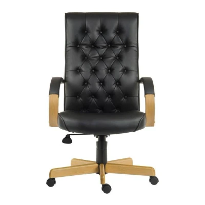 Create a traditional luxurious look in your office space with the Teknik Warwick Leather Reclining Executive Chair, which gives you that well-deserved comfort when you're working.The shiny black bonded leather material with matching arm rest is easy to wipe clean (perfect for coffee spills) and blends perfectly with the sand coloured wooden accents.Thanks to the gas-lift height adjustment, tilt tension and reclining function you can adjust it as you prefer and snugly get in to that position you want.