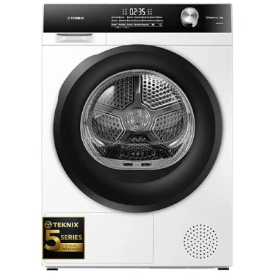 Teknix TK5HP9HW 5 Series 60cm Freestanding 9kg Heatpump Front Load Tumble Dryer Year Cover Quick Dry AI Sensor Drying Rack White A++ Rated