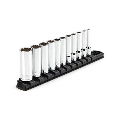 Includes 11-pc. 1/4 in. drive deep 12-point sockets: 5/32, 3/16, 7/32, 1/4, 9/32, 5/16, 11/32, 3/8, 7/16, 1/2, 9/16 in.; Socket rail 12-point opening fits double hex (12-sided), hex, and square-shaped fasteners Socket geometry is designed to apply force to flat sides of fasteners and not the corners, preventing round-off Deep-length sockets reach into wells and accommodate the excess threads of longer shafts Extra-large die-stamped size markings are easy to read and can’t wear off Polished, chrome-plated finish easily wipes clean and is highly resistant to corrosion Four detent grooves provide a secure connection with the drive tool Beveled inner rim of the socket opening helps guide it smoothly onto fasteners Twist-to-lock socket rail organizes and securely holds sockets in place, both for in your toolbox and on the go, Weight: 0.99 Pounds, Manufacturer: TEKTON