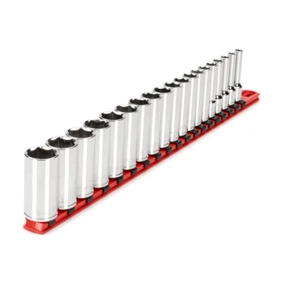 Includes 19-pc. 3/8 in. drive deep 6-point sockets: 6, 7, 8, 9, 10, 11, 12, 13, 14, 15, 16, 17, 18, 19, 20, 21, 22, 23, 24 mm; Socket rail 6-point socket opening provides an ideal, exact fit for hex-shaped fastener heads Socket geometry is designed to apply force to flat sides of fasteners and not the corners, preventing round-off Deep-length sockets reach into wells and accommodate the excess threads of longer shafts Extra-large die-stamped size markings are easy to read and can’t wear off Polished, chrome-plated finish easily wipes clean and is highly resistant to corrosion Four detent grooves provide a secure connection with the drive tool Beveled inner rim of the socket opening helps guide it smoothly onto fasteners Twist-to-lock socket rail organizes and securely holds sockets in place, both for in your toolbox and on the go, Weight: 4.54 Pounds, Manufacturer: TEKTON