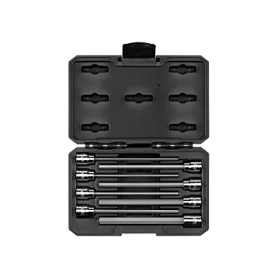 Includes 8-pc 3/8 in. drive 6 in. long hex bit sockets: 1/8, 9/64, 5/32, 3/16, 7/32, 1/4, 5/16, 3/8 in.; Carrying case S2 steel bit is press-fit into the socket for a straight, permanent connection that can't loosen over time 6-sided hexagonal tip is machined to precise tolerances for an exact fit with hex fasteners Extra-long bits allow you to reach deep into especially narrow, recessed areas Large, clear die-stamped size marking is easy to read and can’t wear off Four detent grooves provide a secure connection with the drive tool Polished, chrome-plated finish easily wipes clean and is highly resistant to corrosion Beveled inner rim of the socket opening helps guide it smoothly onto fasteners Sockets come organized in a sturdy case that features strong latches and clear, molded markings for each tool