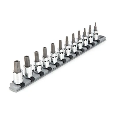 Includes: 12 pc. 3/8 in. drive tamper resistant Torx bit sockets: TR10, TR15, TR20, TR25, TR27, TR30, TR40, TR45, TR47, TR50, TR55, TR60; Socket rail S2 steel bit is press fit into the socket for a straight, permanent connection that can't loosen over time Star shaped Torx bit has 6 lobes and a hollow center to accommodate the post on Tamper Resistant fasteners Large, clear die stamped size marking is easy to read and can't wear off Four detent grooves provide a secure connection with the drive tool.Polished, chrome plated finish easily wipes clean and is highly resistant to corrosion.Twist to Lock Socket Rail organizes and securely holds socket in place both for in your toolbox and on the go, Manufacturer: TEKTON