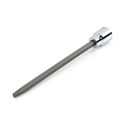 S2 steel bit is press-fit into the socket for a straight, permanent connection that can't loosen over time Star-shaped Torx bit has 6-lobes machined to precise tolerances for an exact, high-torque fit that resists camming out Extra-long bits allow you to reach deep into especially narrow, recessed areas Large, clear die-stamped size marking is easy to read and can’t wear off Four detent grooves provide a secure connection with the drive tool and a drilled through-hole allows locking on with retaining pin Polished, chrome-plated finish easily wipes clean and is highly resistant to corrosion Beveled inner rim of the socket opening helps guide it smoothly onto fasteners Overall Length: 5.9 in., Shaft Diameter: 0.25 in., Drive End Diameter: 0.70 in., Exposed Bit Length: 4.9 in.