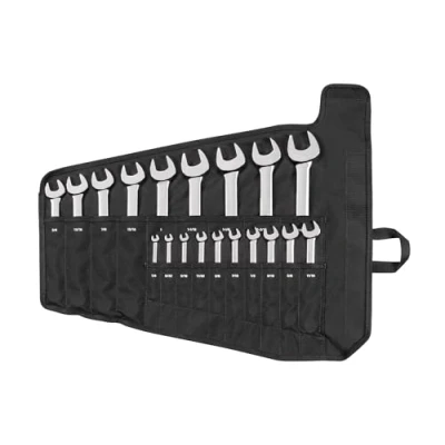 Includes 19-pc. inch combination wrenches: 1/4, 9/32, 5/16, 11/32, 3/8, 7/16, 1/2, 9/16, 5/8, 11/16, 3/4, 13/16, 7/8, 15/16, 1, 1-1/16, 1-1/8, 1-3/16, 1-1/4 in.; Wrench pouch Angled Open End – To reduce the working swing arc in tight spaces, the open end is angled 15 degrees so the wrench can be flipped over with each rotation to engage the fastener twice as often 12-Point Box End – Doubles the available access angles compared to a 6-point end Prevents Round-Off – In order to prevent rounding off fasteners, the box end is designed to contact and apply force to the sides of a fastener head and not the corners Offset Box End – The box end is offset 15 degrees, creating clearance for your fingers and making it easier to reach around obstructions Ideal for On-The-Go – Carry combination wrenches anywhere with the compact roll-up pouch that keeps wrenches well-packed and unable to slide out