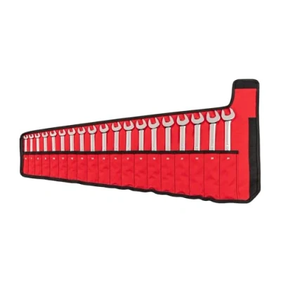 Includes 19-pc. inch combination wrenches: 6, 7, 8, 9, 10, 11, 12, 13, 14, 15, 16, 17, 18, 19, 20, 21, 22, 23, 24 mm; Wrench pouch Angled Open End – To reduce the working swing arc in tight spaces, the open end is angled 15 degrees so the wrench can be flipped over with each rotation to engage the fastener twice as often 12-Point Box End – Doubles the available access angles compared to a 6-point end Prevents Round-Off – In order to prevent rounding off fasteners, the box end is designed to contact and apply force to the sides of a fastener head and not the corners Offset Box End – The box end is offset 15 degrees, creating clearance for your fingers and making it easier to reach around obstructions Ideal for On-The-Go – Carry combination wrenches anywhere with the compact roll-up pouch that keeps wrenches well-packed and unable to slide out