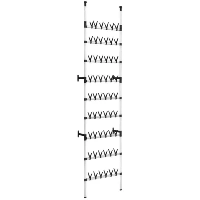 General description This minimalistic shoe rack is an ideal storage solution for your shoes. Made of sturdy aluminium, it features a telescopic system that allows for adjustable height, making it adaptable to different spatial arrangements. This shoe organiser can accommodate up to 54 pairs of shoes, providing a unique and versatile way to organize your footwear while saving space. Technical specifications Colour: Silver and black Material: Aluminium, plastic Dimensions: 66 x 25 x 250-300 cm (W x D x H) Adjustable height up to a maximum of 3 m Net weight: 3.4 kg Load capacity: 35 kg Features 9 rods for 54 pairs of shoes Assembly required: Yes Other information