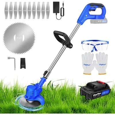 General description The Cordless Strimmer Bundle is a versatile garden tool designed for efficient trimming and edging. With a powerful 21V electric motor, it delivers an impressive rotational speed of 10000 RPM, making it ideal for maintaining both large and small areas. This lightweight and telescopic grass trimmer is perfect for clearing weeds, flowers, and overgrown areas in your garden. Technical specifications Type: Cordless, battery powered Material: Aluminum + Plastic Motor voltage: 21 V Battery capacity: 1.5 Ah Charging time: 40 minutes Rotational speed: 10000 rpm/min Height adjustable: 91.5 cm to 127.5 cm Weight: 2.6 kg Compatibility and accessories Package includes: 1 x Grass Trimmer 1 x 21V/1.5Ah Lithium Battery 1 x Fast Charger 10 x Metal Blades 2 x Circular Saw Blades 1 x Baffle 1 x Auxiliary Handle 1 x Anti-collision Wire 1 x Screw 1 x Wrench Tool 1 x Goggles 1 x Gloves 1 x Instruction Manual Installation Adjust the telescopic pole to the desired height (92 cm to 127