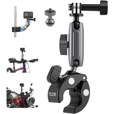 Allows you to securely attach your action camera to any rod, handlebar, or pole with a diameter of 9 to 38 mm. Made of high-quality aluminium alloy that is durable, lightweight, and corrosion-resistant. Features a crab-style clamp that can be easily adjusted and locked with a knob 360-degree adjustable ball head that lets you rotate your camera to any angle you want. Comes with a 1/4"-20 screw adapter and a 3-prong action camera adapter, Compatible with most cameras, such as GoPro Hero, DJI Actio, DJI OSMO action, Insta360 action cameras, and more