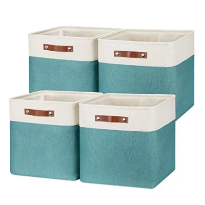 Temary Fabric Storage Cubes 13x13 Baskets for Organizing, 4Pack Large Bins with Handles Cube Clothes, Toys, Books (White&Teal)